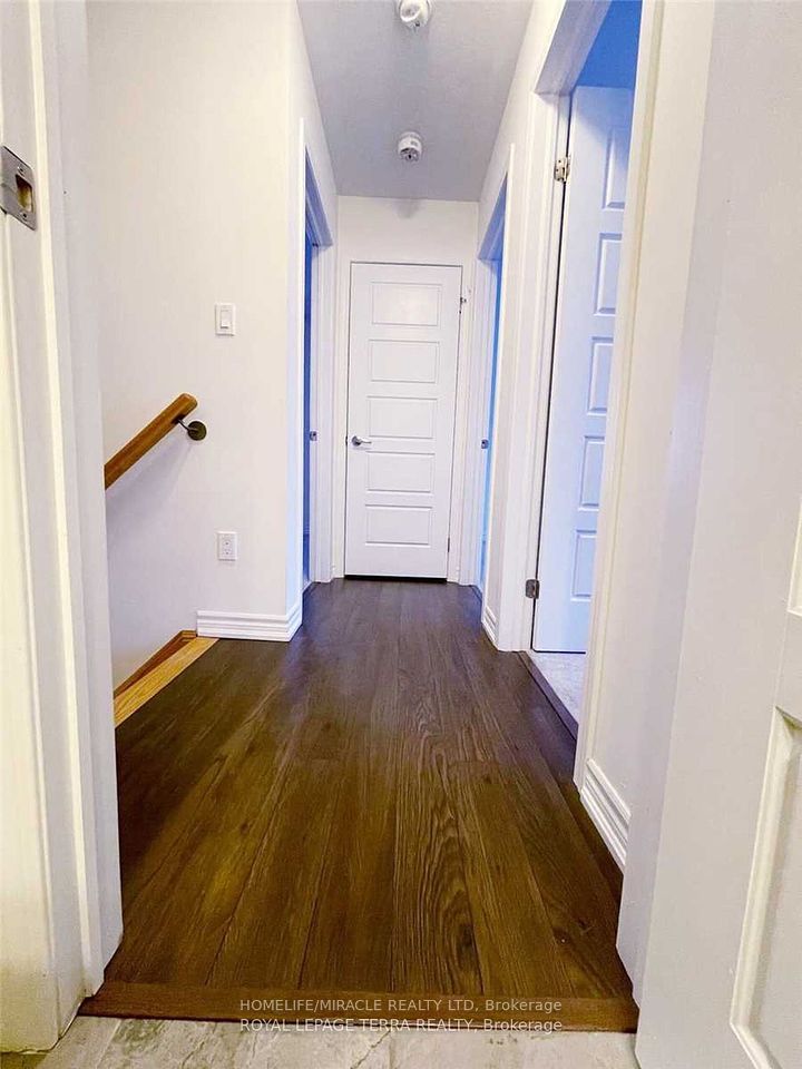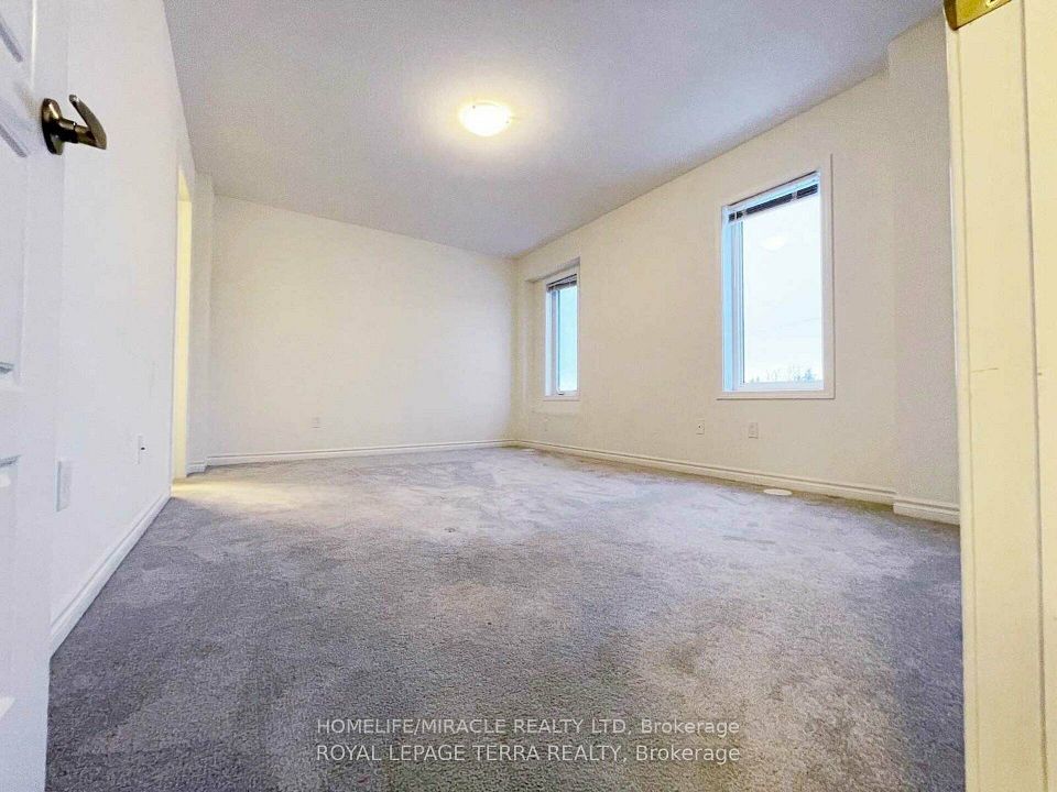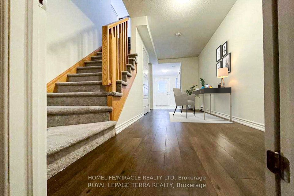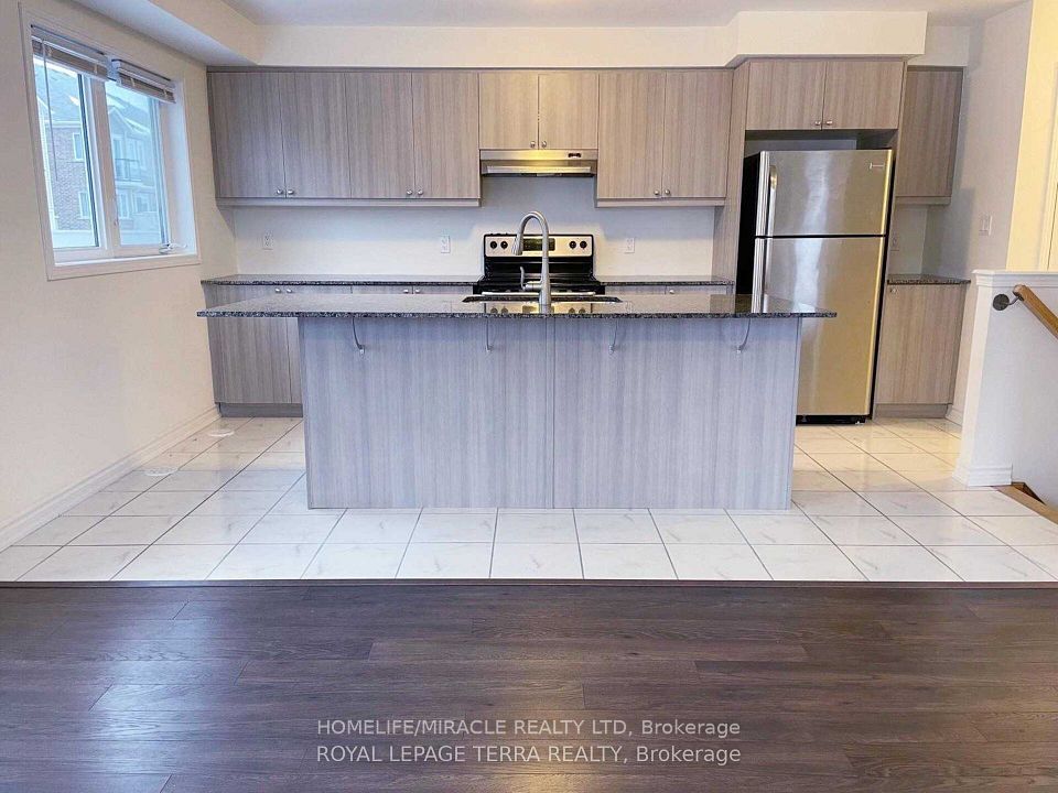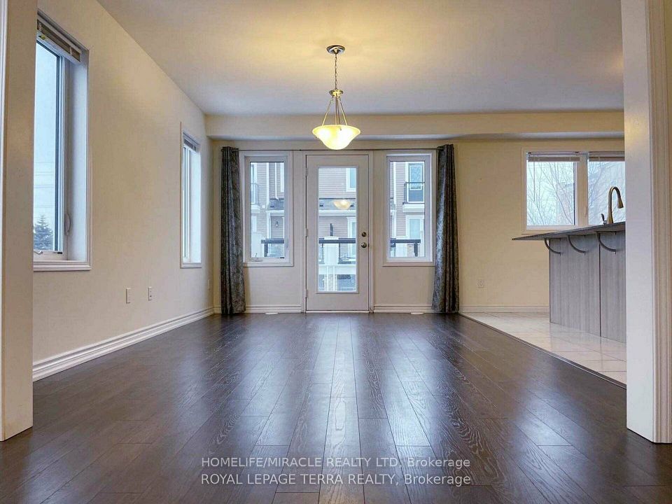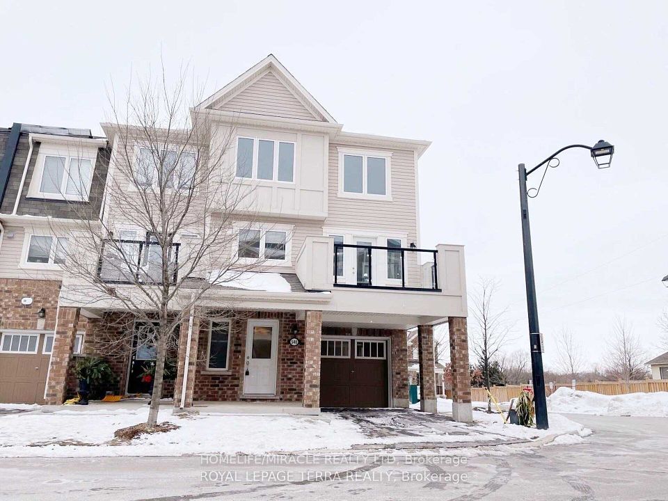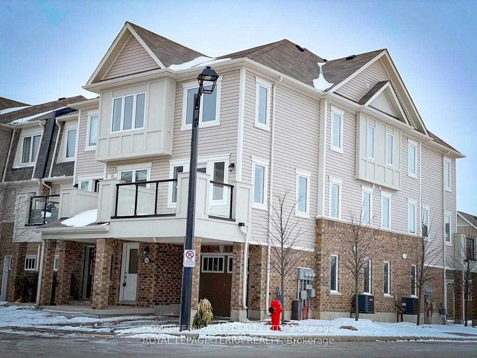 Welcome to this beautifully appointed corner unit, featuring 3 Spacious bedrooms, 2.5 bathrooms, and a versatile ground-level flex room - perfect for a home office or guest space. The upgraded kitchen features granite countertops, a center island, premium cabinetry, and a convenient pantry. Laminate flooring runs throughout the lower and main levels, offering style and durability. The primary suite includes a luxurious 3-piece ensuite and a generous walk-in closet, while an additional 3-piece bathroom serves the secondary bedrooms. Thoughtful conveniences include main floor laundry, direct access from the garage, a charming covered front porch, and a private balcony for outdoor relaxation. Ideally located just minutes from HWY 401 and HWY 8, with easy access to top universities, colleges, shopping centers, playgrounds, public transit, schools and a multiplex under construction at walking distance.